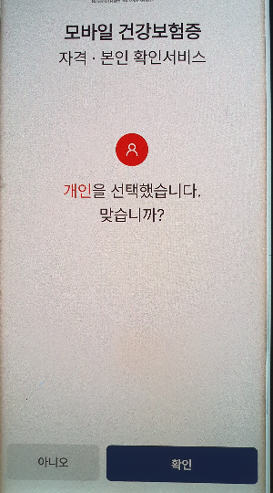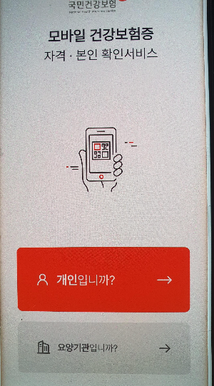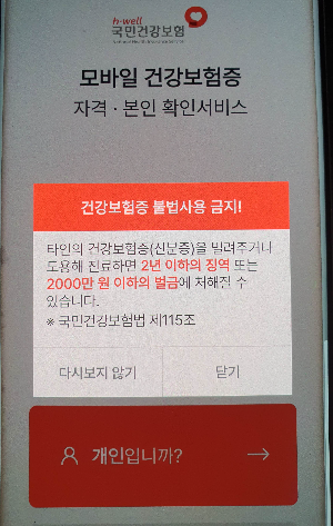 먼저 모바일 건강보험증 앱을 실행해 주세요. 처음에 나오는 건강보험증 불법사용 금지! 팝업은 '닫기' 혹은 '다시보지 않기'를 눌러 없애주세요. 그후 '개인입니까?'를 클릭해주세요.
