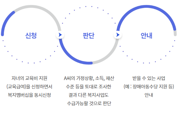 처음 단 한번 가입하면 신청한 사람의 자료를 기반으로 상황이 바뀌면, 시스템이 자동으로 받을 수 있는 복지혜택을 찾아줍니다. 만약 자녀의 교육비 지원을 받기 위해 맞춤형 급여안내를 신청했어도, 자녀 교육비 지원뿐만 아니라, 그 사람의 상황에 맞는 다른 복지 혜택도 같이 안내받을 수 있습니다.