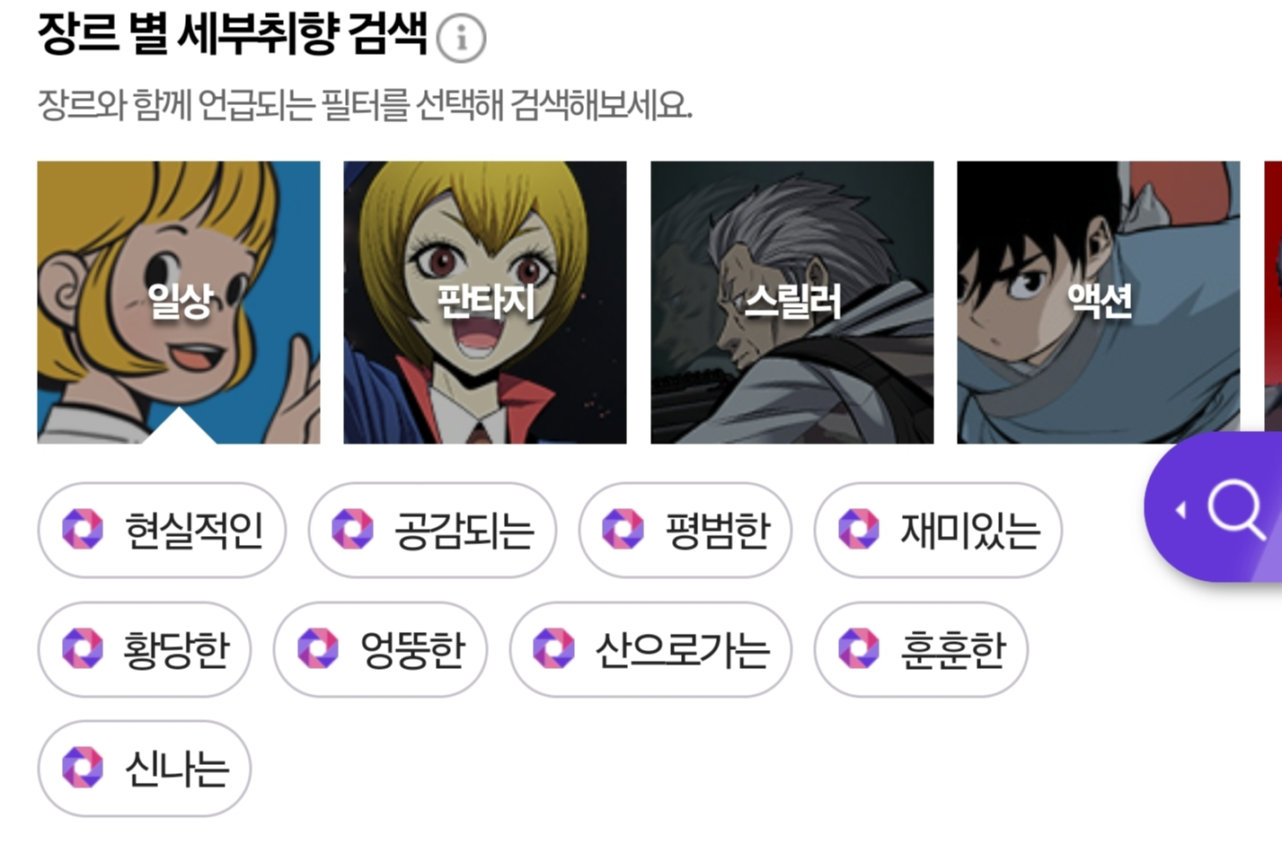 저기 나와 있는 키워드 뿐만 아니라 취향검색을 통해 자신의 취향에 맞는 웹툰을 찾을 가능성이 높아집니다!