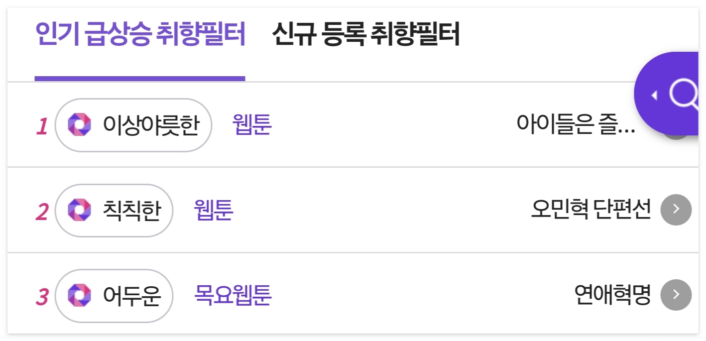 웹툰 메인에서는 정말 다채로운 취향들을 반영하기 위해 '취향 필터'라는 것을 제공하고 있어요.