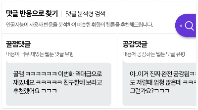 놀랍게도, 독자의 실제 감상을 알수 있도록 댓글 반응을 분석하기도 하는데요. 댓글 분석형 검색이라고 불리는 이 기능은 댓글 유형에 따라 웹툰을 추천해줍니다.
