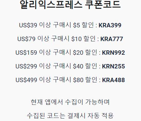 알리익스프레스 앱에서 결제 시 자동으로 할인이 적용됩니다. 알리 앱에서 코드를 확인하실 수 있습니다.