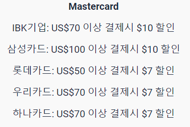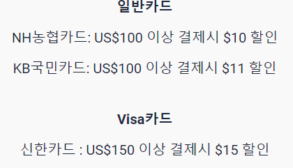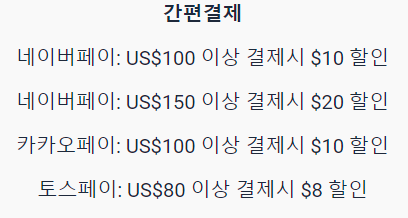 결제 수단에 따라 할인을 받을 수 있습니다. 네이버페이, 카카오페이, 토스페이 같은 간편결제 수단으로는 최대 20달러 할인을 받으실 수 있습니다. 그외 일반카드, Visa카드, 마스터카드에서도 최소 7달러 최대 15달러 할인을 받을 수 있으니 상기 이미지를 참고 해주세요.