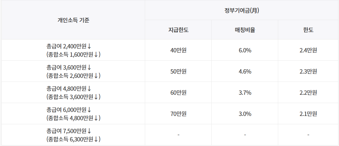 개인소득 조건으로 직전 과세기간(쉽게 말해서 가입 연도의 이전 연도를 말합니다)의 총 급여액이 7,500만원이하이며 종합소득 금액이 6,300만원 이하이어야 합니다. 단, 육아휴직급여, 육아휴직수당 외 비과세 소득만 있으면 그 소득금액은 제외합니다. 또한 직전 과세기간이 확정되지 않은 기간에 소득을 확인한 경우 전전년도 소득으로 인정합니다.