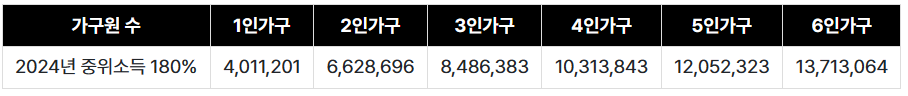개인소득과 더불어 가구소득 조건도 있습니다. 가구원 수에 따른 기준 중위소득의 180% 이하에 해당하여야 합니다. 이때 가구소득은 본인을 포함한 가구원 소득의 합을 의미합니다. 가구원은 주민등록등본에 나와 있는 가족 구성원을 기준으로 판단합니다. 2024년 가구원 수에 따른 중위소득 기준은 위의 이미지에서 확인할 수 있습니다.
