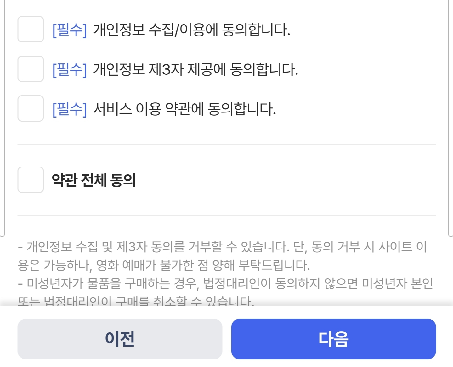 자리 선택까지 다 하셨으면 마지막으로 개인정보 수집 등 약관에 동의해주세요.
